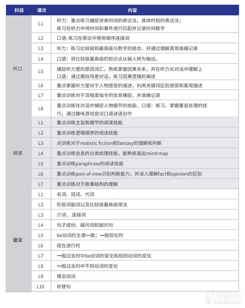 口語:包含順序連接詞使用練習(xí),比較級最高級知識點輸出,因果邏輯闡述,重音處理技巧練習(xí)及口語謎語創(chuàng)作等。