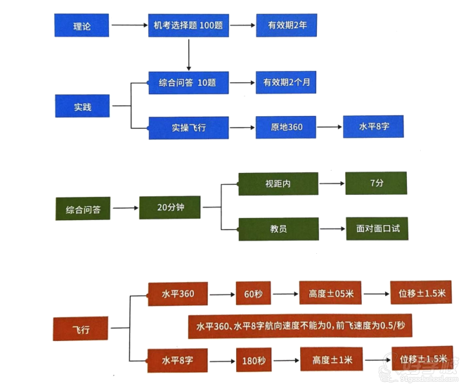 1. 理論考試:視距內(nèi)駕駛員70分合格,超視距駕駛員80分合格。