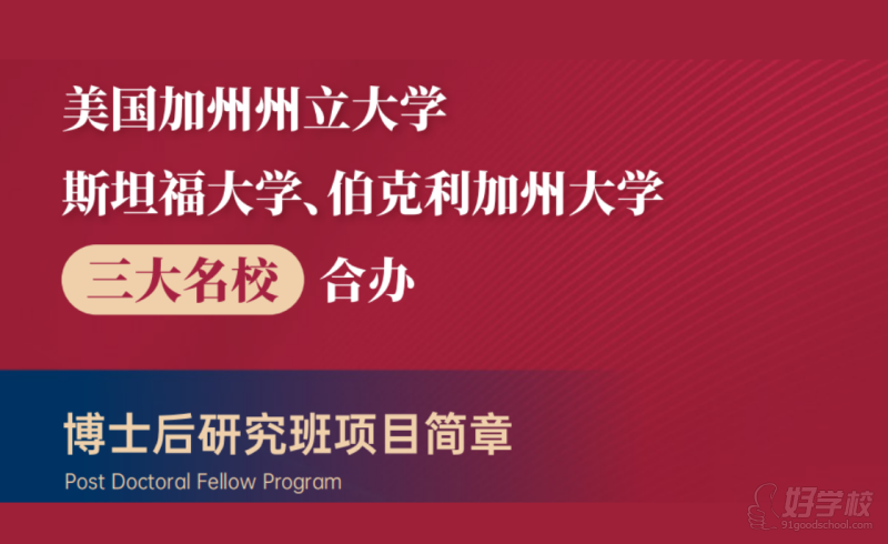 斯坦福大學、美國加州州立大學、伯克利加州大學三大名校聯(lián)合教學,招收中國乃至亞洲地區(qū)具備博士學位的學員參加博士后研究班項目,項目針對系統(tǒng)接受過博士專業(yè)教育的人士開辦,為研究與實踐相結(jié)合的高端教育項目;具備研究和創(chuàng)新能力是學員必備的素質(zhì),參加博士后研究班項目將取得研究經(jīng)驗來提升個人的綜合能力。
