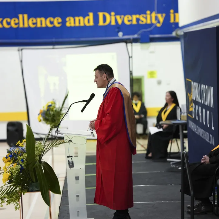 Michael Burke校長以深情的致辭拉開典禮帷幕,他首先向畢業(yè)生父母家人(線上線下)及教職工表達(dá)誠摯謝意,感謝他們?yōu)楫厴I(yè)生所做的支持與教導(dǎo)。正是因?yàn)橛辛怂麄兊男燎诟冻龊蜔o私奉獻(xiàn),畢業(yè)生們才能在皇冠中學(xué)茁壯成長。